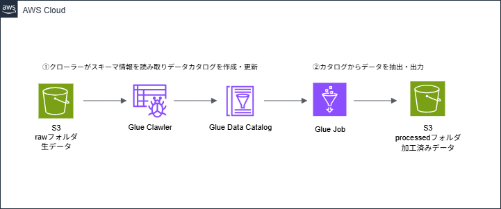 その際にAWS Glueを使用した基本的なETL処理の一貫した流れを記載した記事を見つけられませんでした。