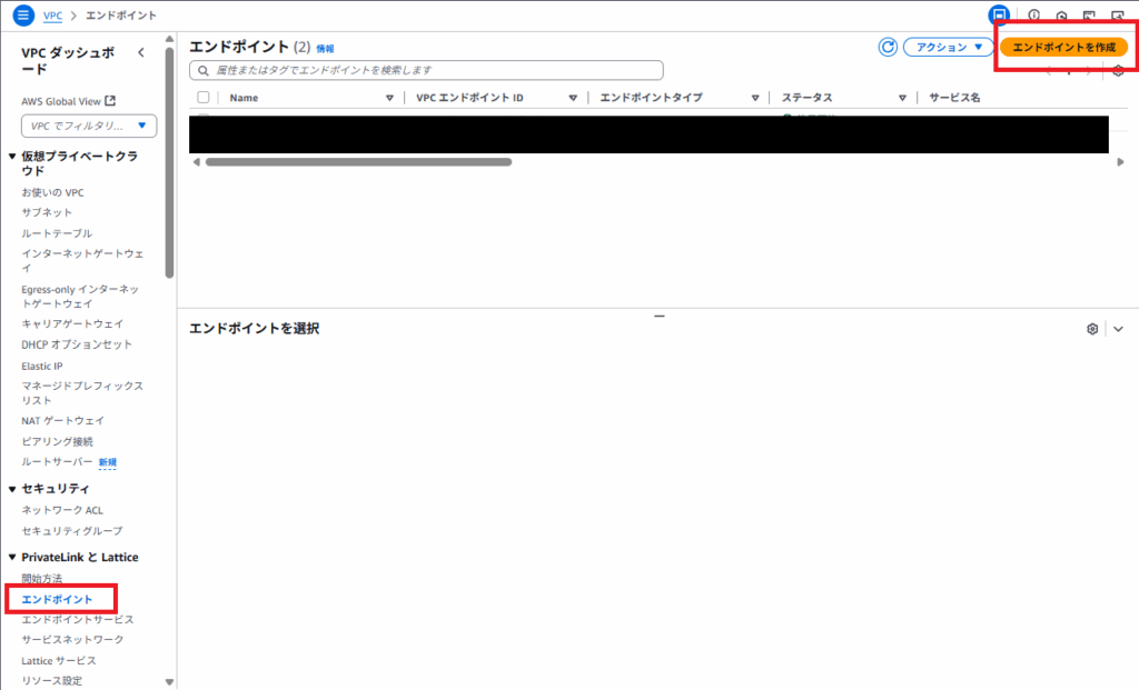 • VPCダッシュボード > 左ペイン内PrivateLinkとLattice内のエンドポイント > エンドポイントを作成、を選択