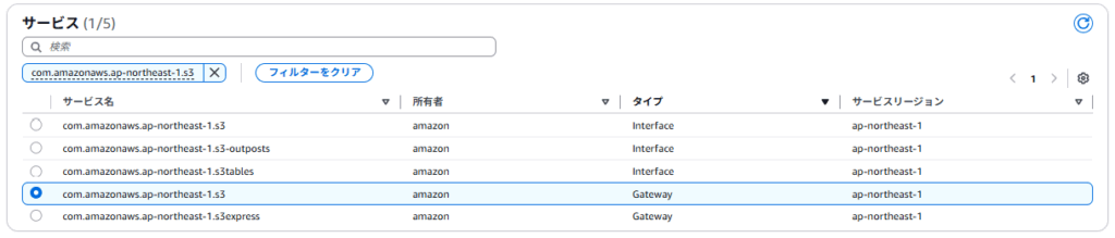 • サービス:com.amazonaws.ap-northeast-1.s3(タイプ:Gatewayを選択すること。)