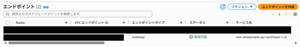 • 作成後、エンドポイントタイプGateway、サービス名com.amazonaws.ap-northeast-1.s3、のエンドポイントが作成されていることが確認できます。