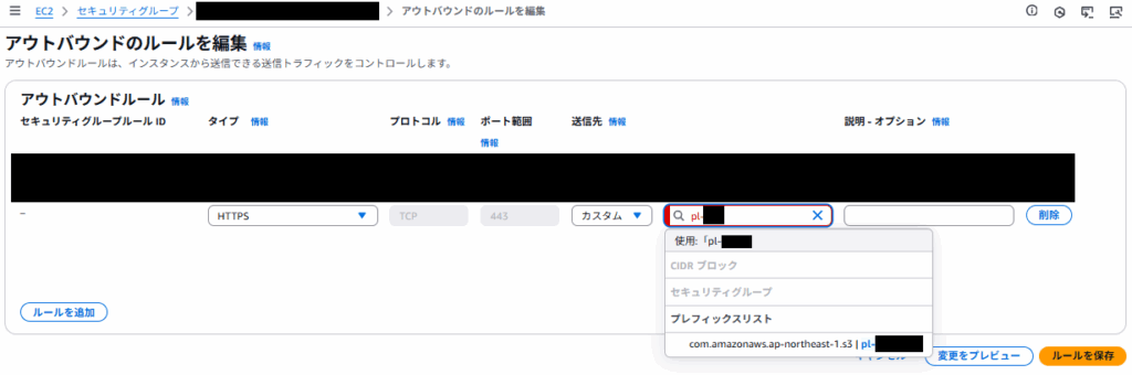 • 送信先:上記より確認したS3ゲートウェイエンドポイントのプレフィックスリストIDを入力し、ルールを保存を選択