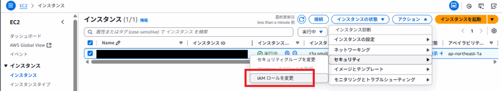 • 右上アクション > セキュリティ > IAMロールを変更、より先ほど作成したいIAMロールを選択し、IAMロールの更新、を選択