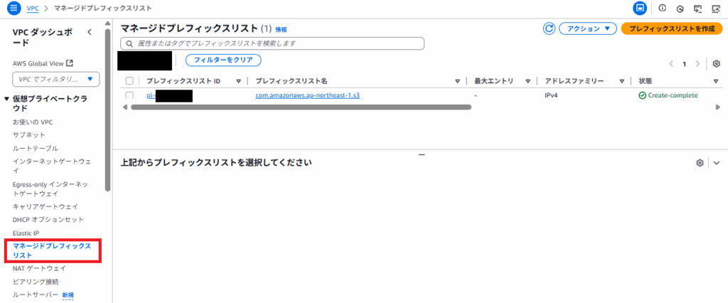 1. 送信先であるS3のプレフィックスリストIDは、VPC > マネージドプレフィックスリスト、から確認する。
