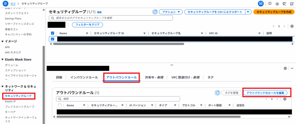 2. セキュリティグループ > 対象EC2に付与しているセキュリティグループを選択(EC2作成時に既に何らかのセキュリティグループを割り当てている前提です。) > アウトバウンドルールタブよりアウトバウンドのルールを編集を選択